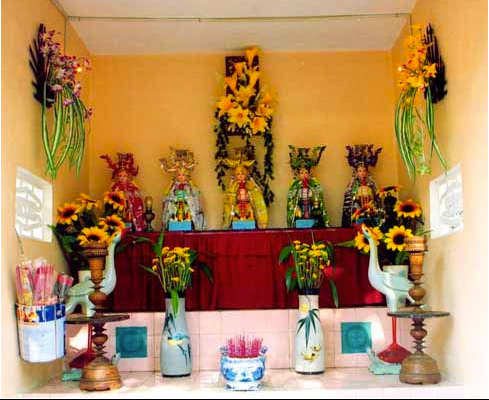 Điện Phật được bài trí trang nghiêm. Tôn trí chính giữa là tượng đức Phật Thích Ca thiền định. Hai bên đặt tượng Bồ tát Quan Thế Âm và Bồ tát Địa Tạng. Bàn trước thờ tượng Bồ tát Di Lặc và tượng Thất Phật Dược Sư. Đối diện với tượng đức Phật Thích Ca là tượng đức Phật A Di Đà, tương Chuẩn Đề, tượng Bồ tát Quan Thế Âm, tượng Hộ Pháp và Tiêu Diện.