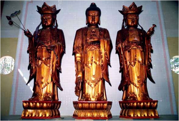 Ở Quang Minh bảo điện, thờ Tây Phương Tam Thánh (đức Phật A Di Đà, Bồ tát Quan Thế Âm và Bồ tát Đại Thế Chí), mỗi tượng cao 4m, nặng 1500kg, tạc bằng danh mộc, được Hòa thượng Thọ Dã thỉnh từ Hồng Kông về năm 1958. Chùa còn được gọi là chùa Tàu, chùa Phật Trầm, theo tông Phật giáo Huê Nghiêm của Trung Quốc.